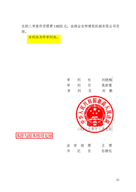 山東金道成機械有限公司于2021年11月26日立案起訴煙臺寶梓建筑機械有限公司侵犯“鍋爐爐膛檢修升降平臺”的專利權一案,經過一審、二審法院2年零11天的審查,于2023年12月07日,中華人民共和國最高人民法院做出(2022)最高法知民終1774號的終審判決: